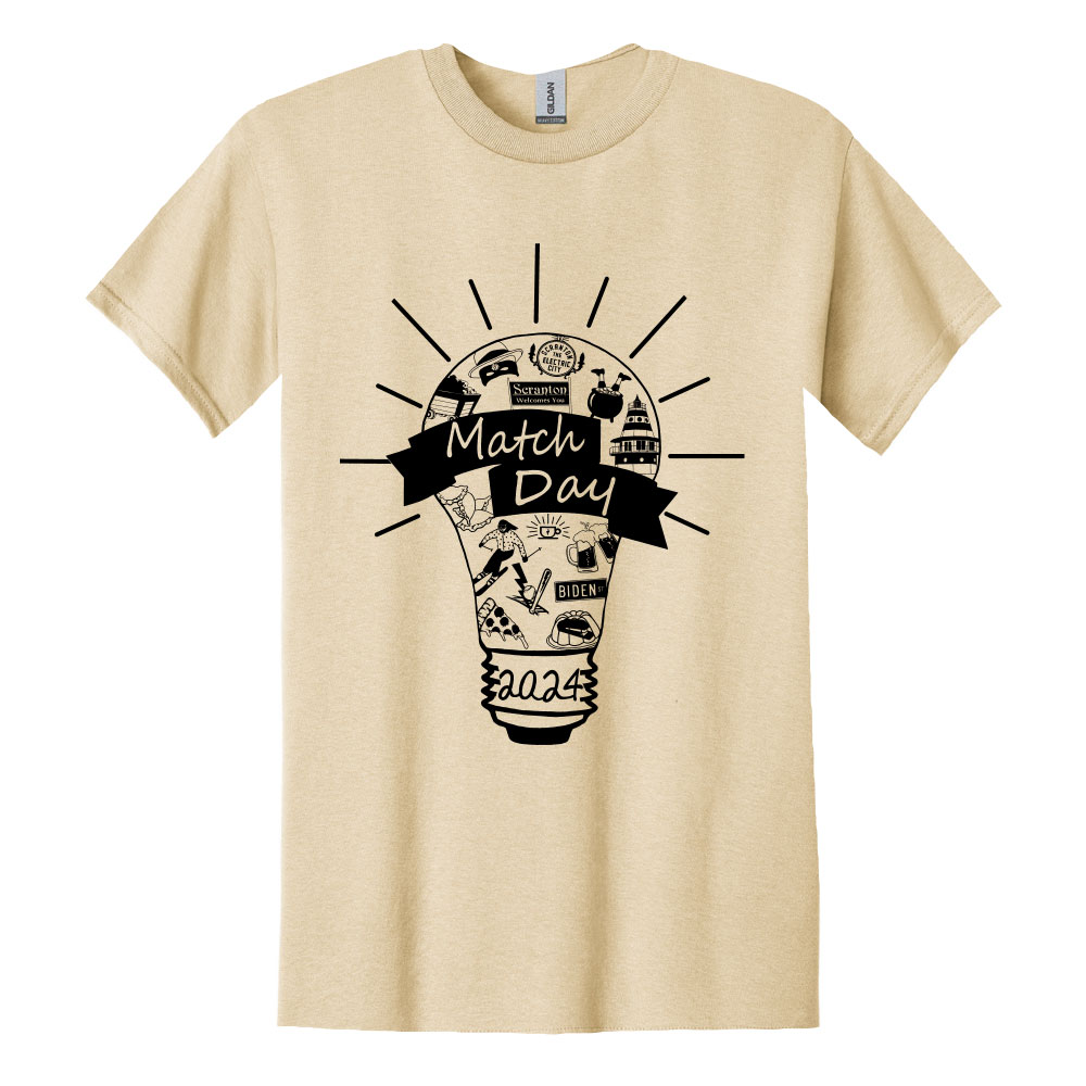 Sand Shirt Imprinted with Match Day 2024 art on front and Geisinger School of Medicine Seal on back.